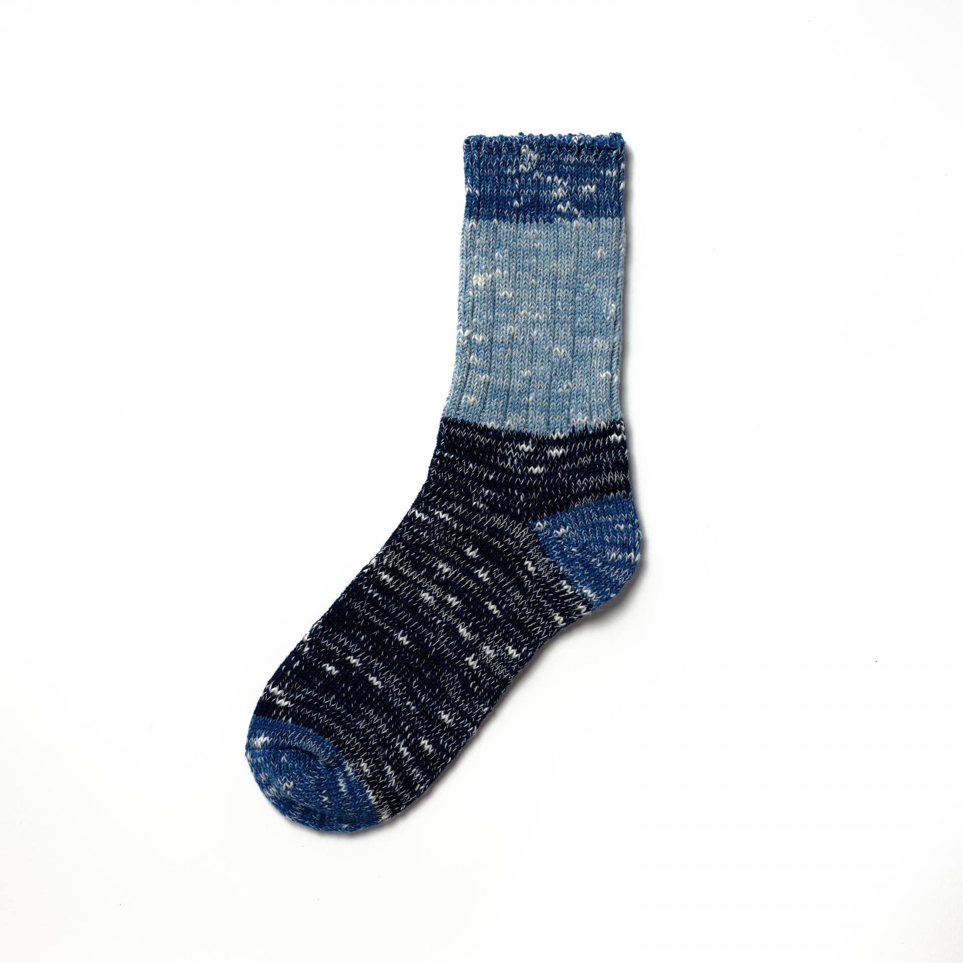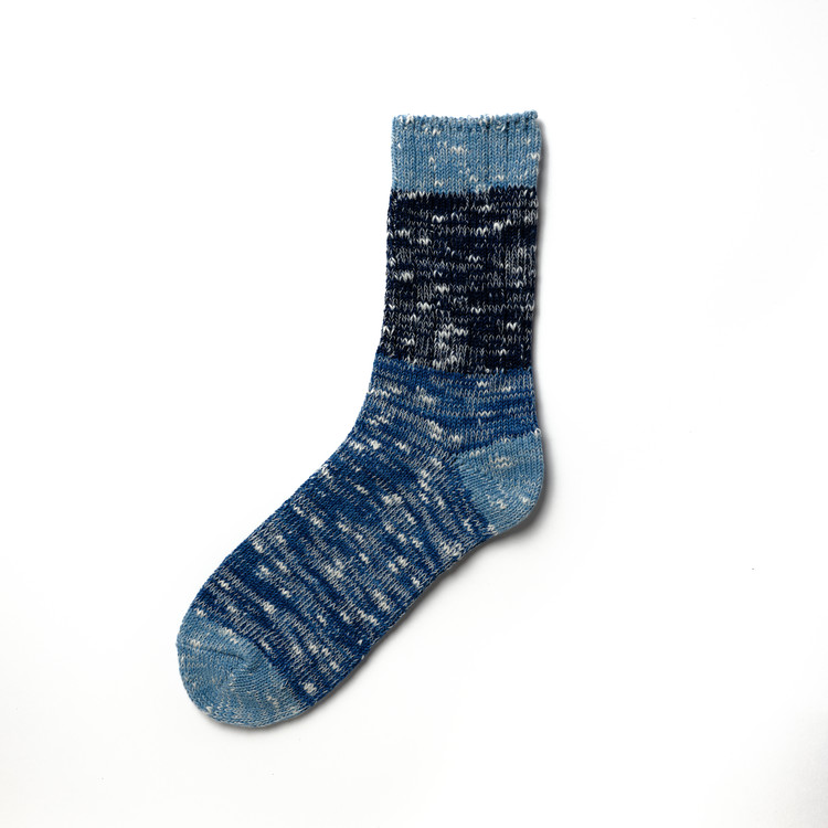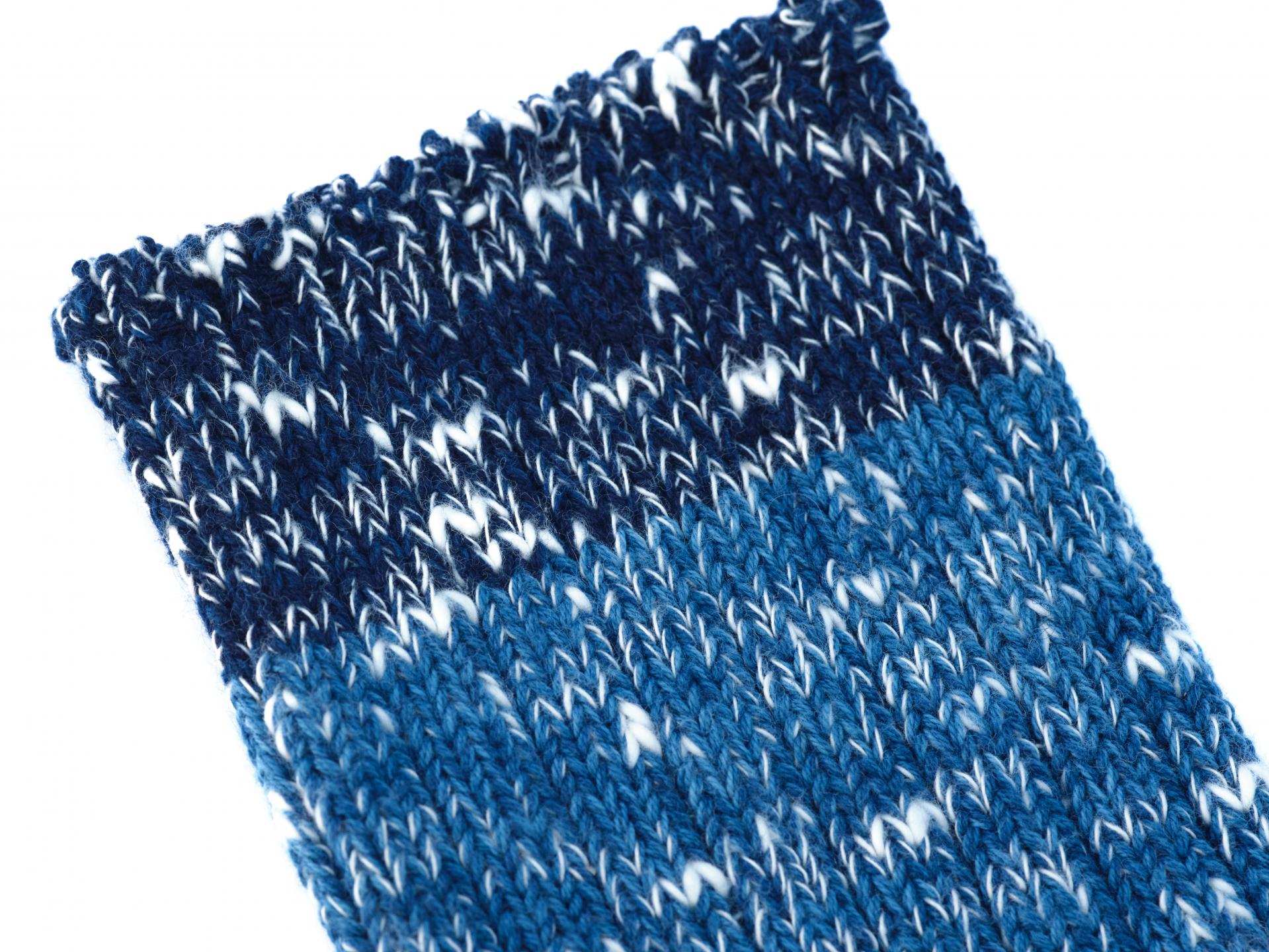 スラブ糸とよばれる不規則に節の入った白色の糸と、共に編み立てることで、より藍が引き立ち、表情豊かな靴下に仕上がった。